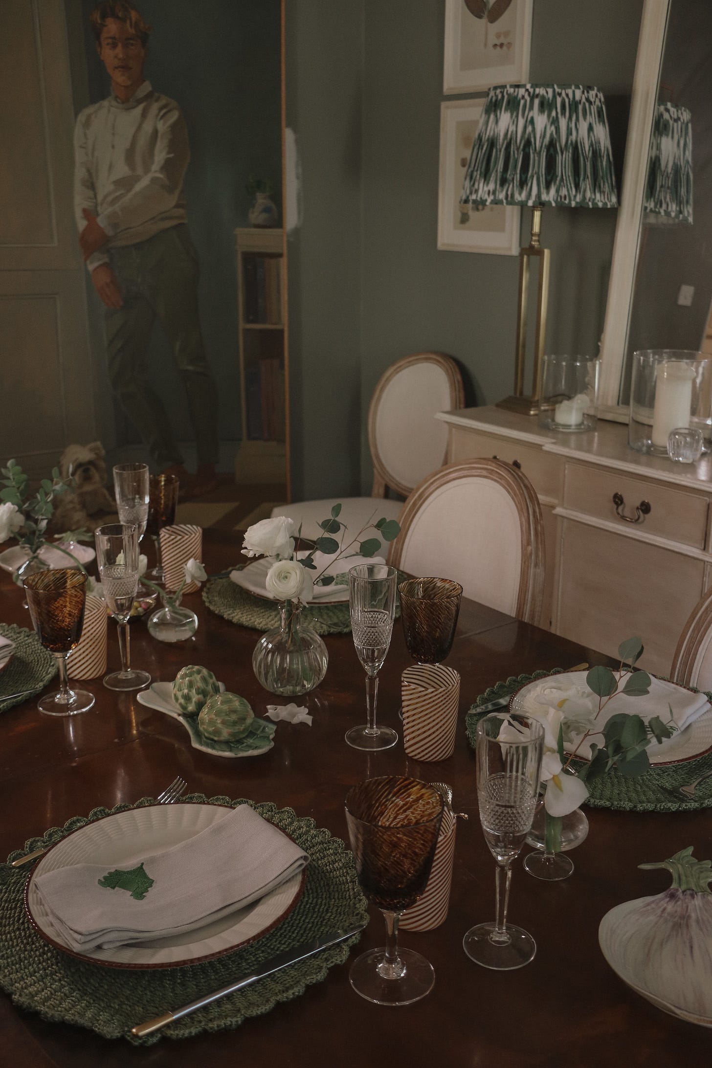 So, almost on a whim, I set the table in the dining room using pieces that always feel like spring to me. Green rattan chargers, basketweave plates, and an assortment of glassware that catches the light beautifully as it moves across the room. I added a few small details, artichoke salt and pepper shakers, some vegetable dishes, and finished it with simple bud vases filled with white flowers.
