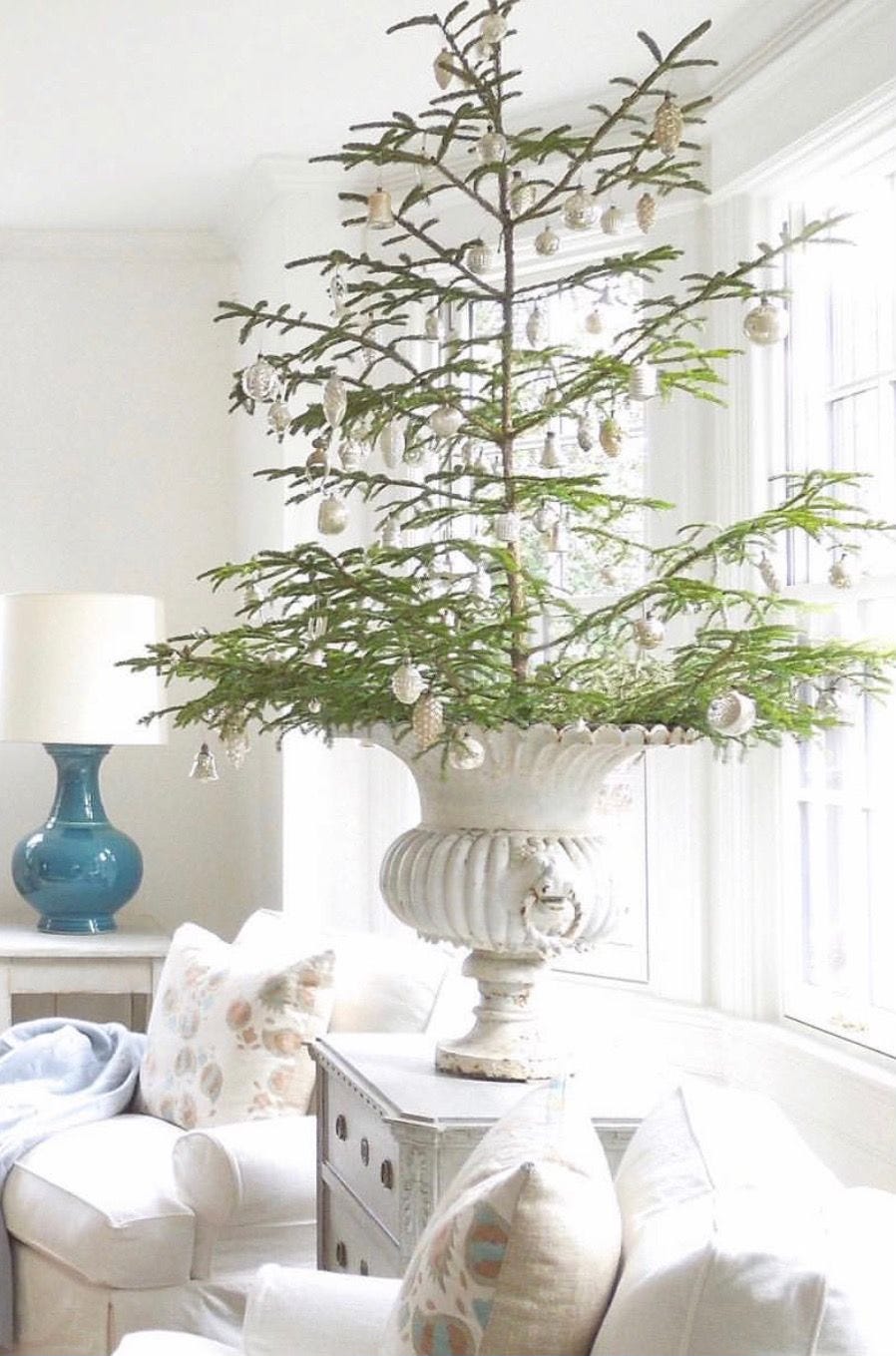 I have been thinking about leaning into a more pared back, Scandinavian inspired Christmas this year. Instead of my usual full sized tree, I am drawn to the idea of a real tree placed in a beautiful pot on top of my round table. For the past five years I have used a Balsam Hill faux tree because it was easy and reliable, but I have begun to miss the natural beauty of a real tree. There is something about the shape, the soft irregularity, and that unmistakable scent that fills a room with such comfort. A smaller tree feels simple and understated, but still deeply charming, and it might be the change I am looking for this year.